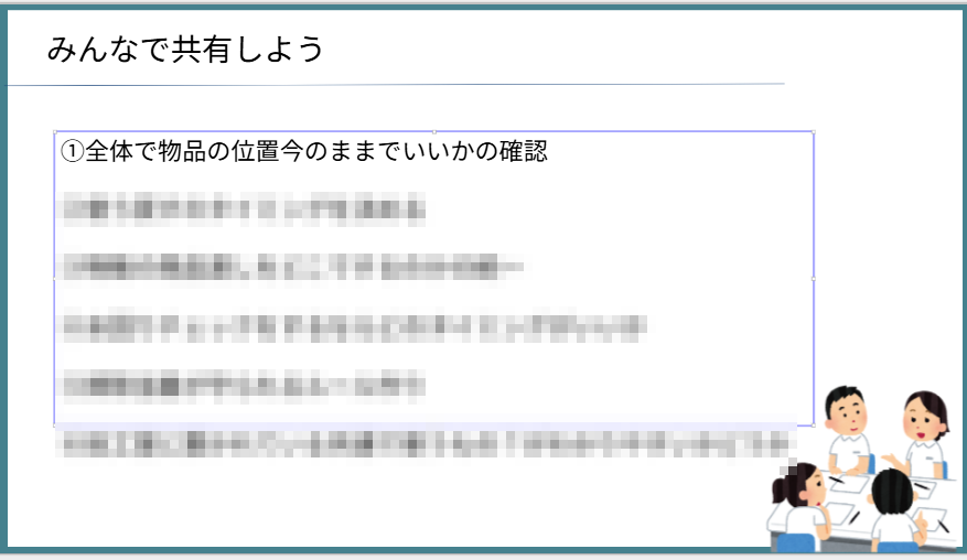前日に1時間弱の事前訪問と、当日は院長とスタッフさん総勢13名、「片付け研修1時間+実際の片付け3時間」で完了いたしました。