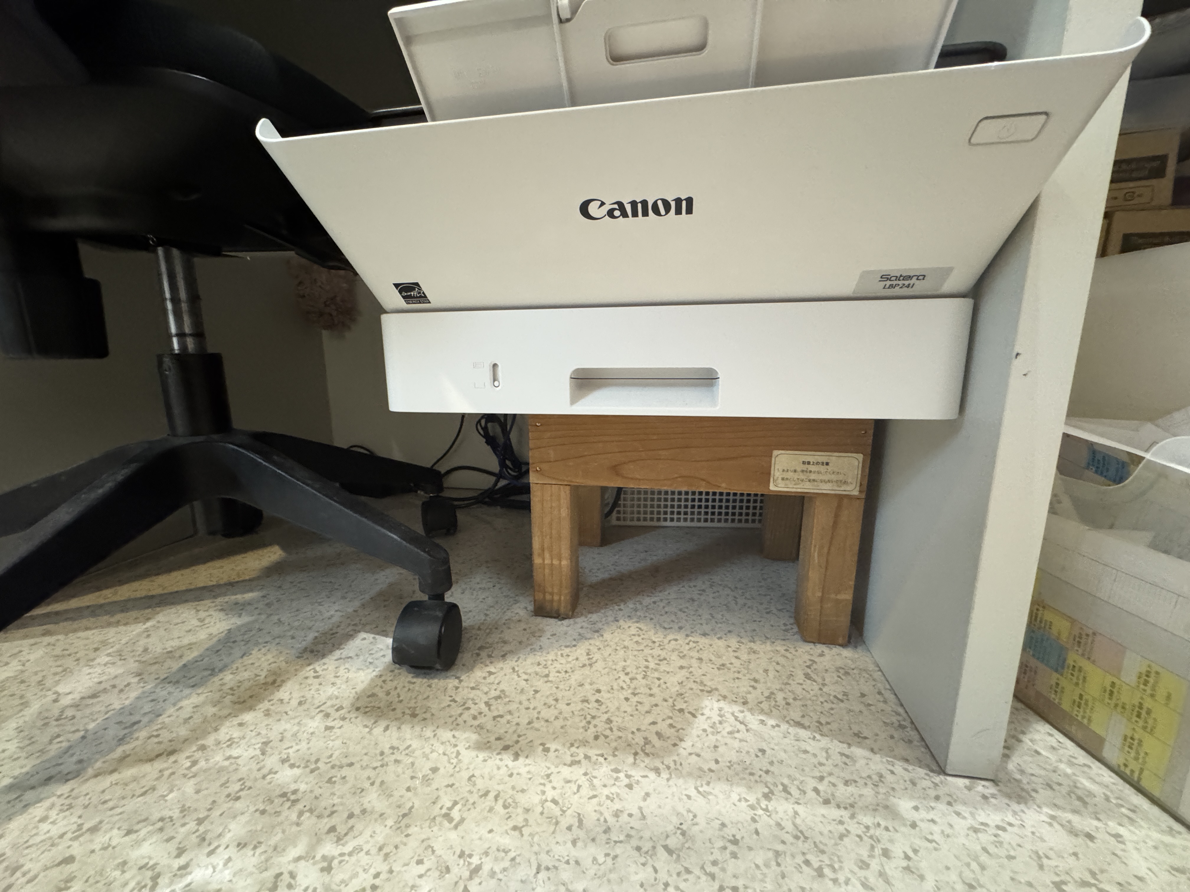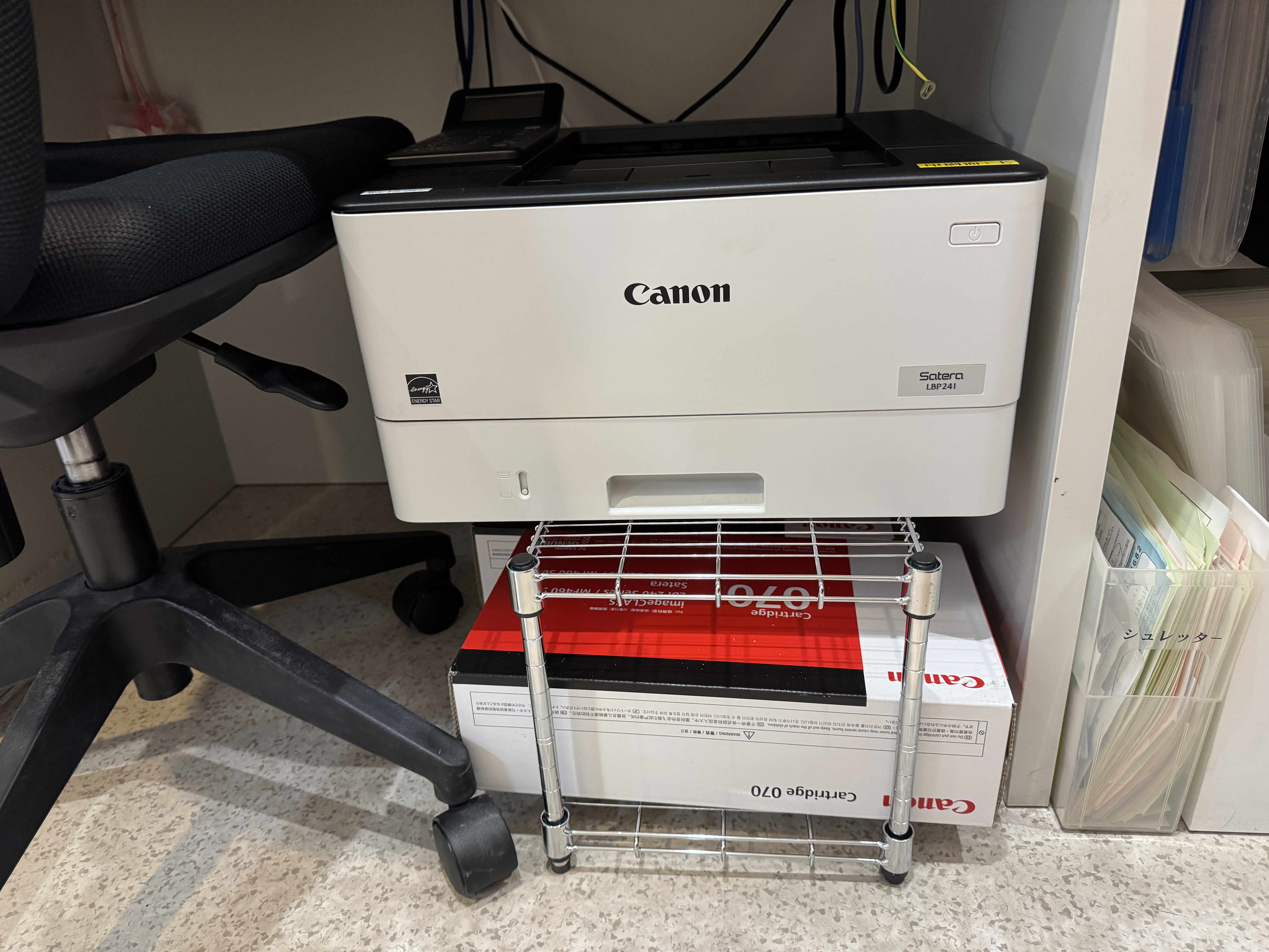 スチールラックに変更し、プリンターの使用物品とまとめて収納。