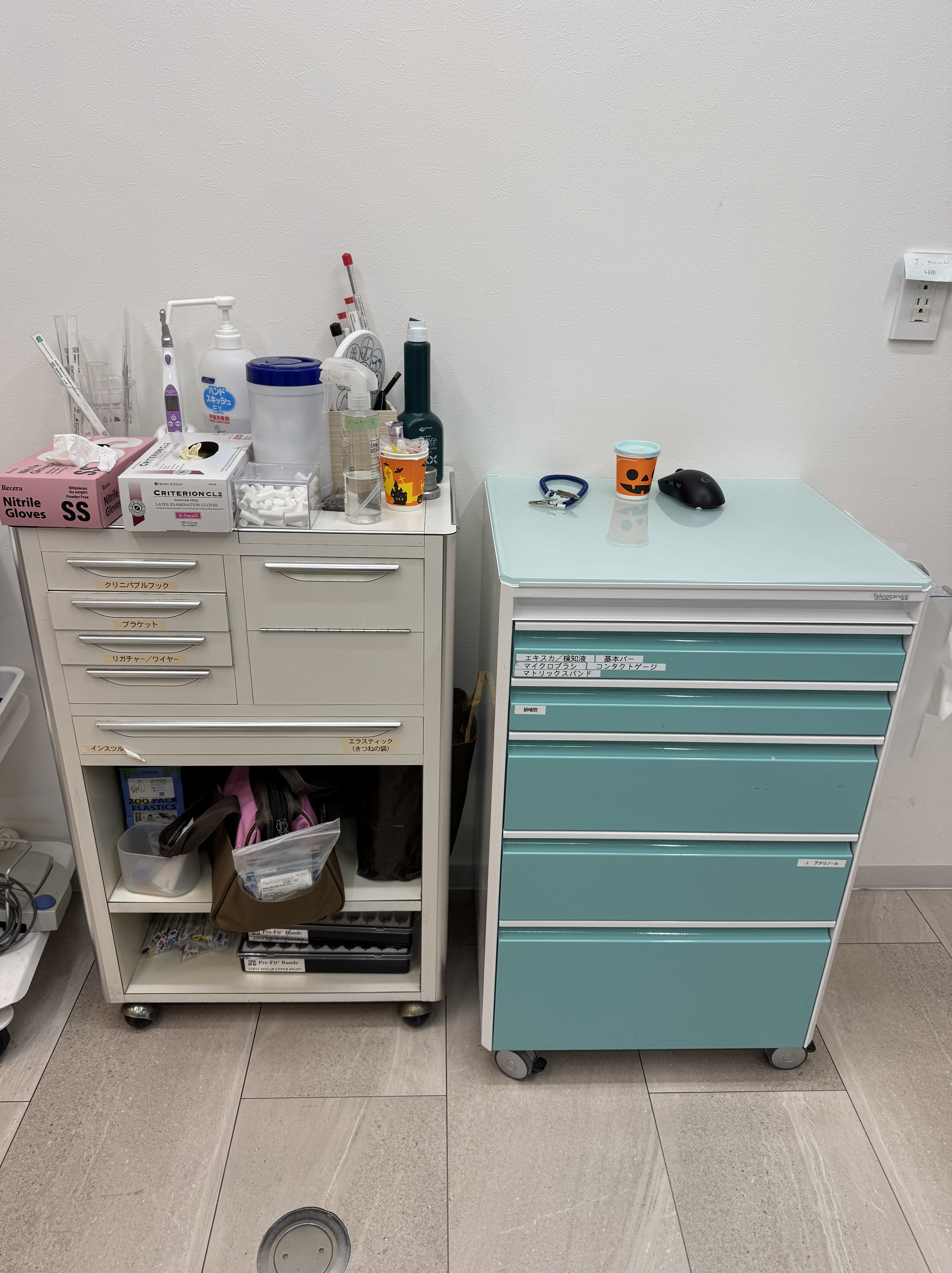 左のワゴンが使いづらかったため、今回新たに収納ワゴン(青)を追加購入で、必要な使用器具が使用頻度に合わせて引き出し内に収納されました。